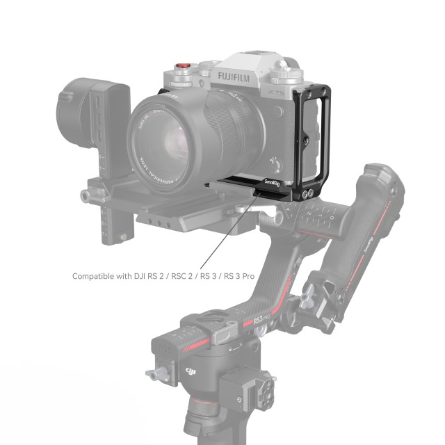 SmallRig L-Bracket für FUJIFILM X-T5 4137 wurde entwickelt, um den Wechsel zwischen horizontalem und vertikalem Modus zu erleichtern und das Griffgefühl zu verbessern. Er fixiert die Kamera mit einer 1/4"-20 Schraube und einem Fixierstift an der Unterseite. Gummipuffer verhindern Kratzer und bieten vollen Zugriff auf Tasten, Kartensteckplätze, Batteriefach und Flip-Screen. Neben einem eingebauten Blackwood-Griff für ein verbessertes Grifferlebnis verfügt die Platte auch über verschiedene Zubehörhalterungen. An der Unterseite befindet sich eine Arca-Swiss-Schnellwechselplatte für Arca-Swiss-Stative und DJI RS 2 / RSC 2 / RS 3 / RS 3 Pro Gimbals, 1/4"-20-Gewindebohrungen und 3/8"-16-Gewindebohrungen, die die Manfrotto-Platte 1280 oder den Side Handle 2093 für vertikale Handheld-Aufnahmen unterstützen.