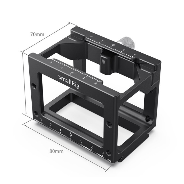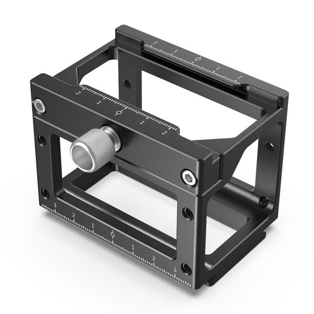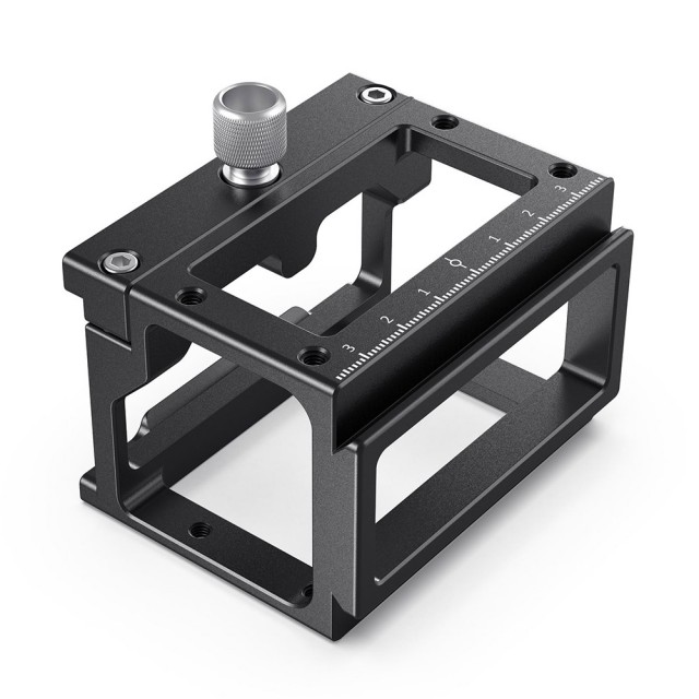 Die Skalenmarkierung auf der Oberseite und an der Seite erleichtert die Positionsbestimmung. Es kann den Auslöser in der Mitte aufnehmen, so dass der Auslöser nicht aufgehängt werden muss. Außerdem gibt es viele M5-Gewindebohrungen an den Seiten, die Kabel können mit M5-Flügelmuttern befestigt werden, was Ihr Rig übersichtlich und sauber macht.