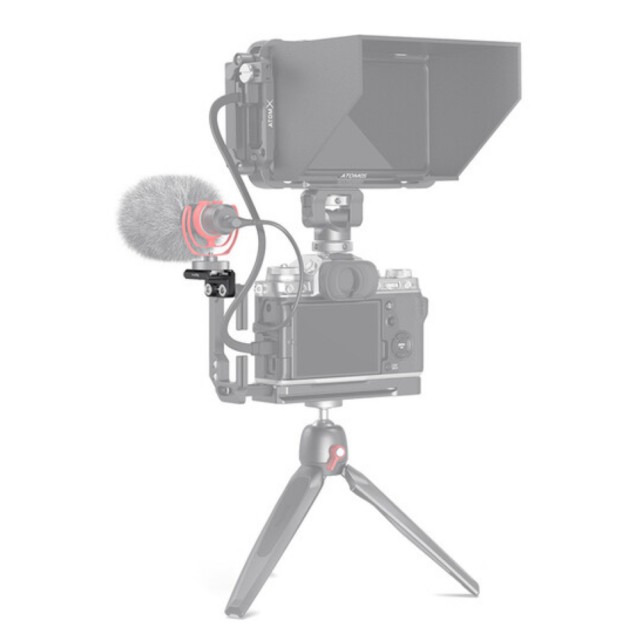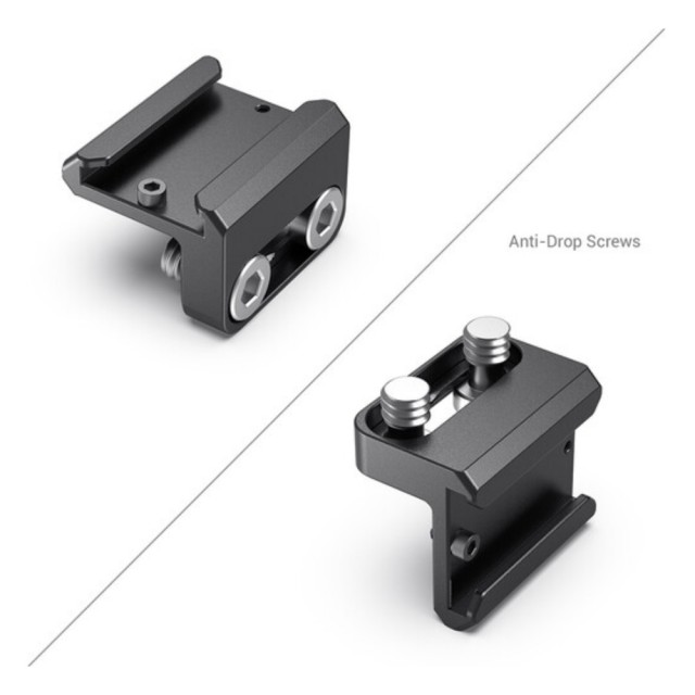 Die L-förmige Halterung ist so konzipiert, dass sie die Kamera aufnehmen kann, ohne den Zugang zu Anschlüssen oder Löchern zu blockieren, und hat einen bequemen integrierten Holzgriff auf der rechten Seite. Es verfügt über zahlreiche 1/4"-20-Gewinde zur Befestigung von Zubehör, eine rollfeste Konstruktion und eine integrierte Arca-Stativplatte. Die Steckdosenhalterung wird mit zwei 1/4"-20-Schrauben an der Halterung befestigt, verfügt über ein Gewinde mit Sicherheitsanschlag und ermöglicht die einfache Befestigung von Zubehör an der Steckdose.
