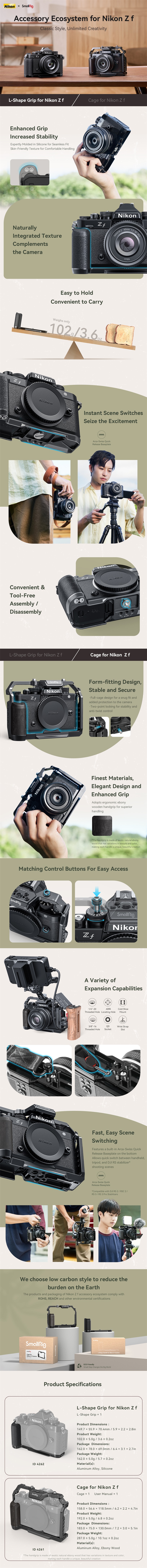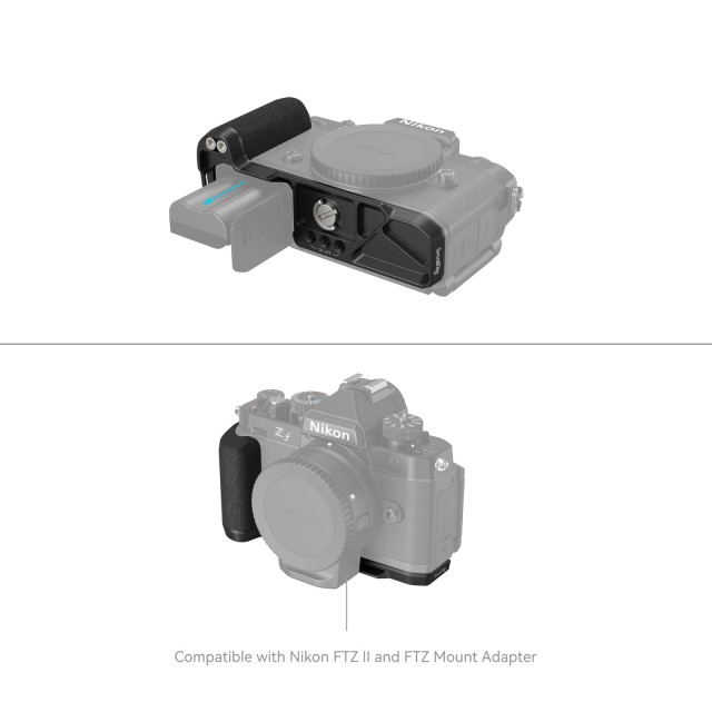 Der SmallRig Dedicated Handle für Nikon Z f 4262 wurde entwickelt, um die Griffigkeit zu verbessern. Er passt perfekt zur Nikon Z f, da er die gleiche Textur und Farbe wie die Kamera hat. Der Griff wird mit einer 1/4"-20 Rändelschraube und einem D-Ring an der Unterseite befestigt. Die eingebaute Arca-Swiss-Schnellwechselplatte unterstützt Stative des Arca-Typs; drei 1/4"-20-Gewindelöcher an der Unterseite eignen sich auch für Stative und Manfrotto-Schnellwechselplatten; und die Löcher für das Handgelenk können mit dem Handgelenkriemen 3848 / 3926 verwendet werden. Außerdem verfügt die Bodenplatte über ein ultradünnes Design, um ein Nettogewicht von nur 102 g zu erreichen, was diesen Artikel noch kompakter und leichter macht.