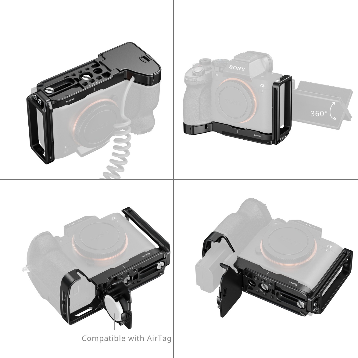 Die SmallRig L-förmige Montageplatte mit AirTag-Steckplatz für Sony Alpha 7 V / 7R V / 7 IV 6034 wurde entwickelt, um einen schnellen Wechsel zwischen horizontaler und vertikaler Aufnahme zu ermöglichen. Sie lässt sich mit einer 1/4"-20-Schraube sicher an der Kamera befestigen und verfügt über Schutzpolster, um Kratzer zu vermeiden.