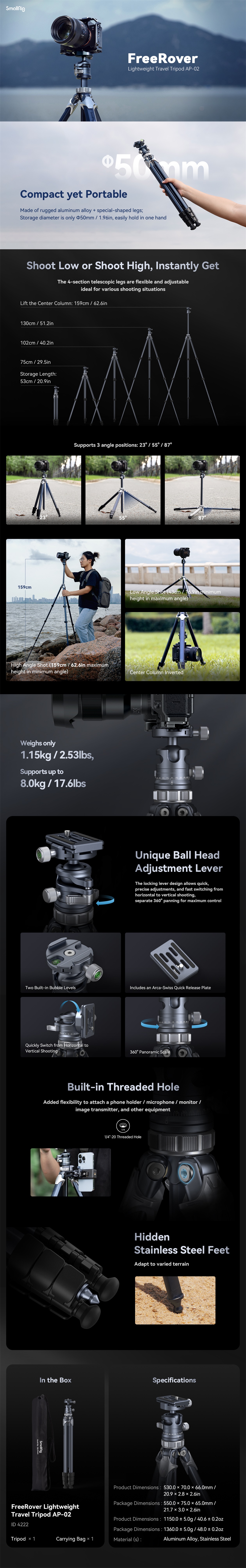 SmallRig Lightweight Travel Tripod AP-02 4222 je kompaktní stativ z hliníkové slitiny speciálně navržený pro fotografování. Využívá nekruhové trubky nohou a nekruhový středový sloupek pro maximální kompaktnost a úsporu místa a také zachovává maximální stabilitu. Horní šroub 1/4"-20 a 3/8"-16 podporuje různé fluidní hlavy pro fotografování a natáčení videa; a tři otvory se závitem 1/4"-20 v kloubech nohou umožňují připojení ramen Magic Arm 3238 a 2115C pro mikrofon, monitor, systém přenosu obrazu atd. Silikonové podložky pod nohy mají skryté patky s hroty, které vyhovují různě složitým terénům a lze je používat i po sejmutí silikonových podložek pod nohy.