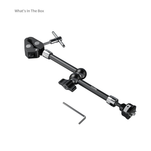 SmallRig Magic Arm mit krabbenförmiger Klemme (11") 5311 besteht aus einem Magic Arm und einer krabbenförmigen Klemme. Ein Ende ist mit einer 1/4"-20 Schraube und einziehbaren Stiften ausgestattet, die mit einer gerändelten Rändelschraube für eine einfache werkzeuglose Befestigung versehen sind, zusammen mit einem zusätzlichen Sicherungsloch zum Festziehen mit dem mitgelieferten Inbusschlüssel.