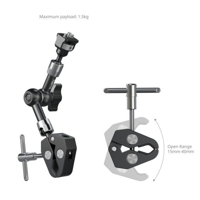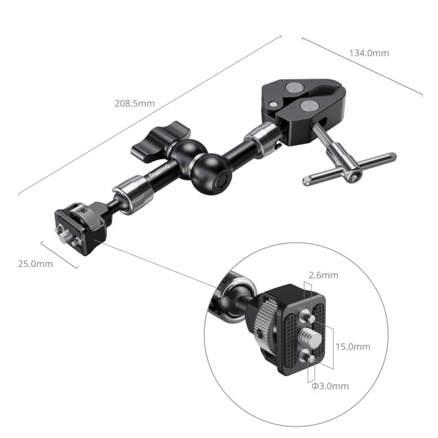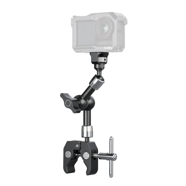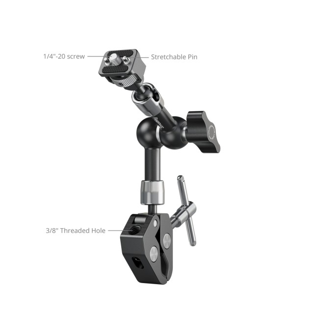 SmallRig Magic Arm mit krabbenförmiger Klemme (7") 5310 besteht aus einem Magic Arm und einer krabbenförmigen Klemme. Ein Ende ist mit einer 1/4"-20 Schraube und einziehbaren Stiften ausgestattet, die mit einer gerändelten Rändelschraube für eine einfache werkzeuglose Befestigung versehen sind, zusammen mit einem zusätzlichen Sicherungsloch zum Festziehen mit dem mitgelieferten Inbusschlüssel.