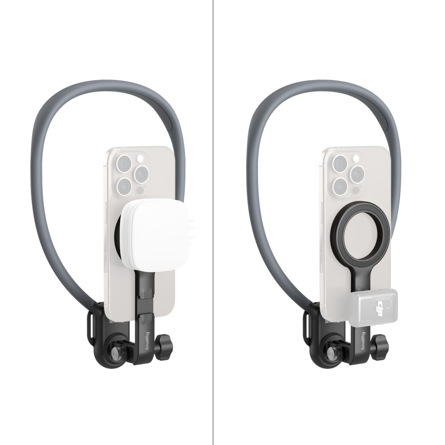 Die Nackenhalterung verfügt über eine universelle 2-Zacken-Halterung für Action-Kameras und eine magnetische Handyhalterung für die sofortige Befestigung des iPhones. Die Handyhalterung ist mit 17 starken N52-Magneten ausgestattet, die für einen sicheren Halt sorgen, sowie mit einem zusätzlichen magnetischen Adapterring für Android- und Nicht-MagSafe-Geräte. Wenn sie nicht für Smartphones verwendet wird, kann die Nackenhalterung direkt für Action-Kameras verwendet werden.