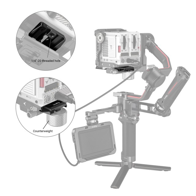 3158 wurde entwickelt, um die Kamera beim schnellen Wechsel zwischen Manfrotto Stativ-, Schulter-, Gimbal- und anderen Aufnahmemodi zu unterstützen. Die integrierte Manfrotto-Schnellwechselplatte wird mit zwei Schrauben an der Unterseite der Kamera oder des Camcorders befestigt, was ein Verdrehen effektiv verhindert. Die Platte verfügt über eine 1/4-Gewindebohrung am Ende und kann mit Gewichten oder dem Gegengewichts-Kit 3125 für das Gleichgewicht ausgestattet werden. An der Unterseite der Platte befindet sich eine abnehmbare Zahnstange, um die Kamera vorwärts oder rückwärts zu verstellen. Ausgestattet mit drei M4-Gewindebohrungen, die mit der originalen Follow-Focus-Stabhalterung kompatibel sind.