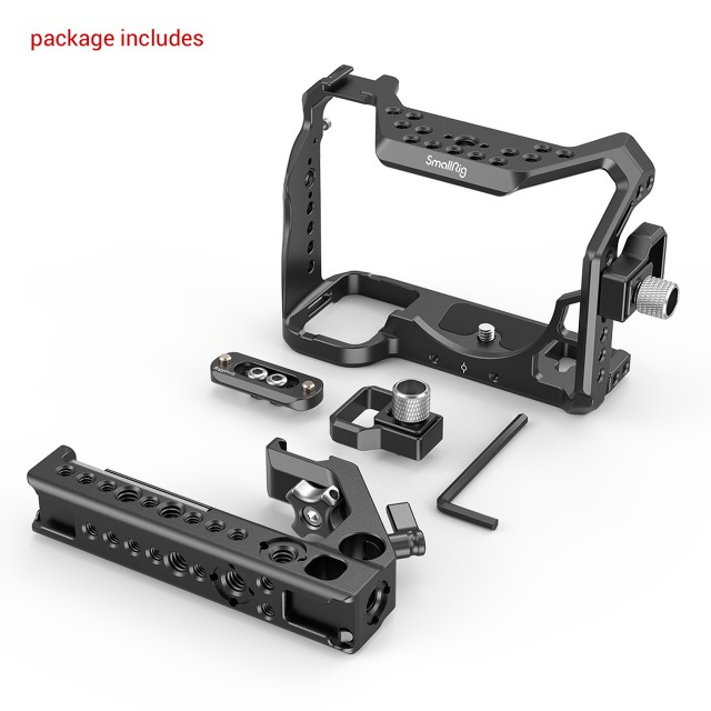 Das SmallRig Master Kit für Sony Alpha 7S III A7S III A7S3 3009 umfasst einen Aluminium-Vollkäfig, eine HDMI-Kabelklemme, eine dünne NATO-Schiene und einen oberen Handgriff mit NATO-Schnellwechselschalter. Der Kamerakäfig verfügt über mehrere 1/4"-20- und 3/8"-16-Montagegewinde, eine NATO-Schiene, einen Kaltschuhanschluss und Zubehörhalterungen im ARRI-Stil. Die HDMI-Klemme wird mit einer 1/4"-20-Schraube und zwei verdrehsicheren Stiften an der Seite des Käfigs befestigt und verhindert ein versehentliches Abziehen des HDMI-Kabels der Kamera. Die NATO-Schiene wird mit zwei 1/4"-20-Schrauben an der Oberseite des Käfigs befestigt, und der obere Griff lässt sich schnell an der Schiene anbringen, so dass er bequem in der Hand liegt.