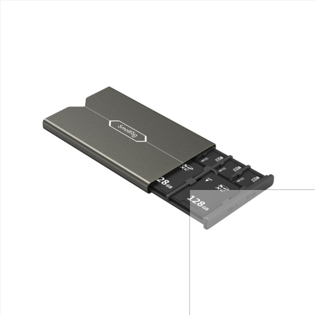 Das SmallRig Speicherkartenetui für SD und Micro SD (TF) 2832B ist ein Zusatzprodukt für Fotofreunde. Es kann drei SD-Karten und sechs Micro-SD-Karten aufnehmen, was praktisch für die Aufbewahrung der Speicherkarten von Kameras, Action-Kameras und Drohnen ist. Jede Speicherkarte hat einen eigenen sicheren Platz, der schnell und sicher in den Kartenschlitz geschoben werden kann. Kartenfächer mit aufgedruckten Namen der kompatiblen Karten dienen der schnellen Identifizierung. Er ist kompakt und leicht zu verstauen. Das Außengehäuse besteht aus einer robusten Aluminiumlegierung, das Innengehäuse aus ABS+PC-Material. Die ausziehbare Struktur erleichtert den schnellen Zugriff auf die internen Elemente.