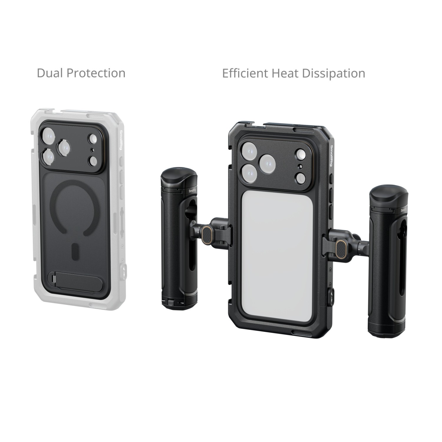 Das SmallRig Mobile Dual Handheld Kit für iPhone 17 Pro 5540 ist eine professionelle Dual-Handheld-Lösung, die speziell für das iPhone 17 Pro entwickelt wurde und professionelle Videoaufnahmen, Live-Streaming und Kurzfilmproduktionen ermöglicht. Dieses umfassende Kit enthält eine Handyhülle, einen Videokäfig, einen drehbaren seitlichen Griff mit Funksteuerung, einen drehbaren Seitengriff und einen weichen TPU-Stoßfänger.