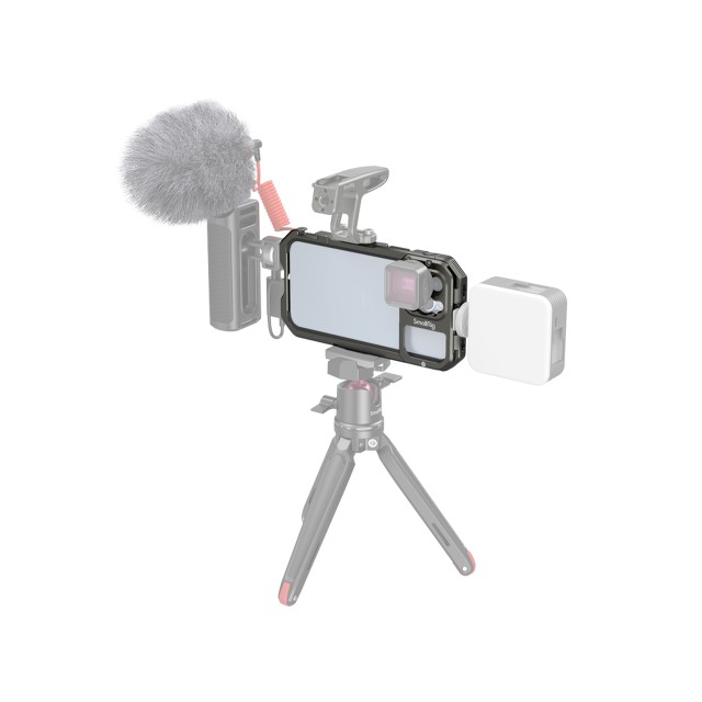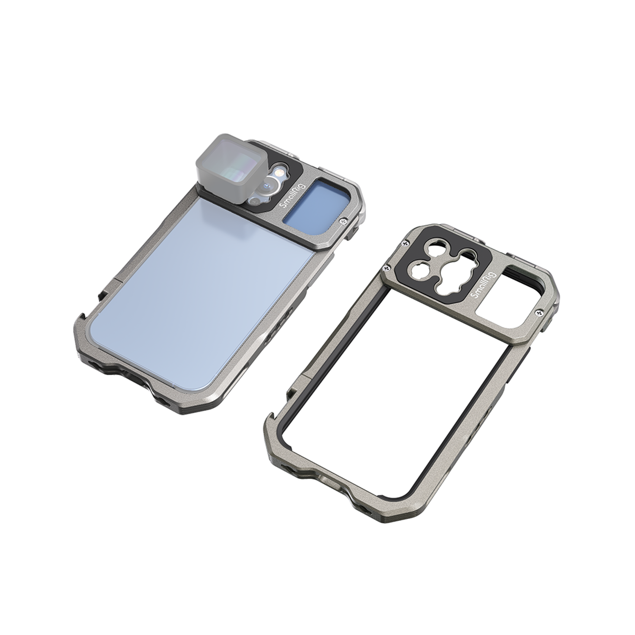 SmallRig Mobile Video Cage 3561 ist ein multifunktionaler, speziell für das iPhone 13 Pro Max entwickelter Käfig für professionelle Videografie, Live-Streaming und Vlogging. Der kompakte, formschlüssige Käfig wiegt nur 95 g und verfügt über 1/4"-20-Gewindebohrungen und Kühlschuhe, die Zubehör wie den Seitengriff 2772, das Stativ BUT2664, das Mikrofon 3452 und die LED-Leuchte 3286 unterstützen. Die hintere Objektivabdeckung ist austauschbar und kompatibel mit M-Mount- oder 17-mm-Gewindeobjektiven für eine bessere Bildqualität. Das hohle Design blockiert nicht die Tasten und Anschlüsse des iPhones und ermöglicht die Verwendung von Radar, Ultra-Weitwinkelobjektiven und drahtlosem Laden. Dank des Schnellverschlusses lässt sich der Käfig leichter montieren und demontieren, ist sicherer und stabiler und springt bei versehentlicher Berührung nach der Verriegelung nicht auf. Der aus Metall gefertigte Vollkäfig schützt das Smartphone zusammen mit den eingebauten Unterlegscheiben und verhindert Vibrationen und Kratzer. Der Käfig ermöglicht horizontale und vertikale Aufnahmen.