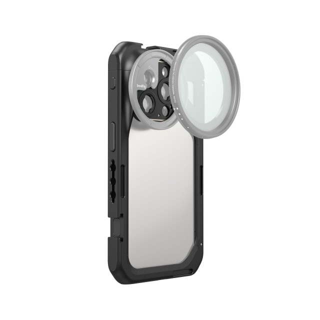 SmallRig Mobile Video Cage für iPhone 15 Pro 4396 ist ein multifunktionaler Handykäfig, der speziell für das iPhone 15 Pro entwickelt wurde, um hochwertige Videoaufnahmen, Live-Streaming und Vlogs zu realisieren. Der kompakte und formschlüssige Käfig wiegt nur 106 g. Sie verfügt über 1/4"-20-Gewindelöcher und kalte Schuhe zur Befestigung von Handgriff, Stativ, Mikrofon, LED-Videolicht usw., was durch ein brandneues Quick-Release-Ökosystem noch einfacher und schneller geht. Auf beiden Seiten des Käfigs befinden sich Löcher für Gurte mit einem Durchmesser von weniger als 2 mm. Der Käfig ermöglicht die Montage eines M-Mount-Objektivs oder, durch den Austausch einer Rückplatte, eines Objektivs mit 17-mm-/37-mm-Gewinde, eines Objektivs der Moment T-Serie. Er ist dezent ausgehöhlt, um vollen Zugang zu allen Tasten, Anschlüssen, dem Radar-Ultraweitwinkelobjektiv und dem drahtlosen MagSafe-Ladegerät zu ermöglichen. Die einfach zu bedienende Schnellverriegelung und -entriegelung ist sicherer und stabiler und verhindert ein versehentliches Entriegeln durch eine falsche Berührung. Der Ganzmetallkäfig verfügt über integrierte Pads, um mögliche Stöße und Kratzer zu vermeiden. Das Anbringen dieses Käfigs beeinträchtigt nicht die Möglichkeit, horizontal oder vertikal zu fotografieren.
