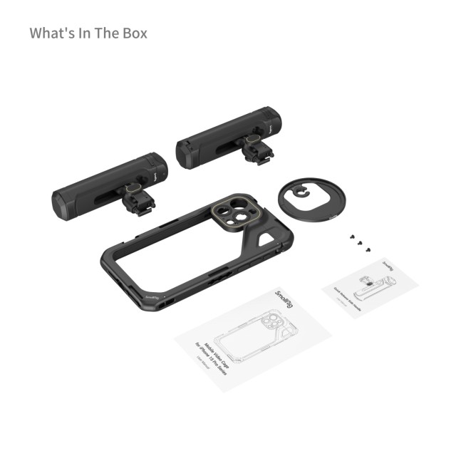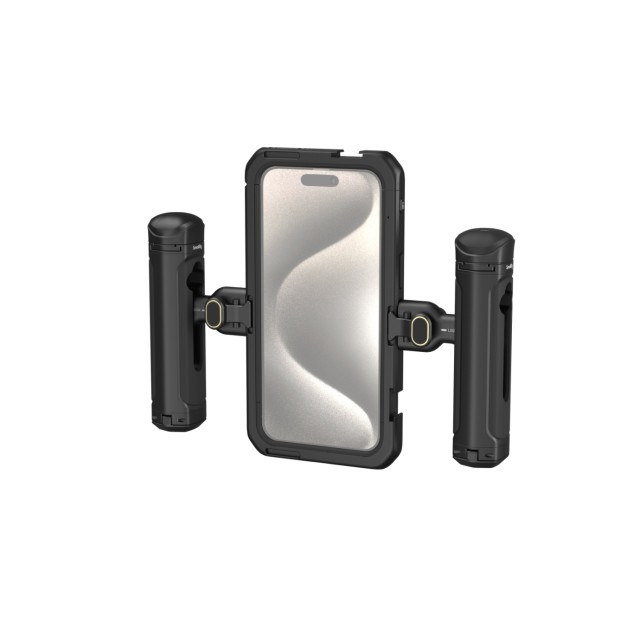 Das SmallRig Mobile Video Kit (Dual Handheld) für iPhone 15 Pro Max 4392B enthält zwei Griffe für stabile Video- und Vlogging-Aufnahmen; die kabellose Steuerung ermöglicht Aufnahmen mit nur einem Klick". Der Käfig verfügt über mehrere 1/4"-20-Gewindebohrungen und Cold Shoes zur Befestigung von Griff, Stativ, Mikrofon, LED-Videoleuchte usw. Sie alle sind mit dem neuen SmallRig Quick Release Ecosystem ausgestattet, das einen einfachen und sofortigen Wechsel zwischen horizontaler und vertikaler Ausrichtung der Kamera ermöglicht. Außerdem unterstützt der Vollmetallkäfig Objektive wie das M-Mount-Objektiv oder, durch den Austausch einer Rückplatte, ein Objektiv mit 17mm / 37mm-Gewinde, Moment T-Serie. Es ist dezent ausgehöhlt, um vollen Zugang zu den Tasten, Anschlüssen, dem Radar und dem Ultra-Weitwinkel-Objektiv des iPhones sowie zum kabellosen MagSafe-Ladegerät zu ermöglichen, wobei integrierte Pads mögliche Stöße und Kratzer verhindern.