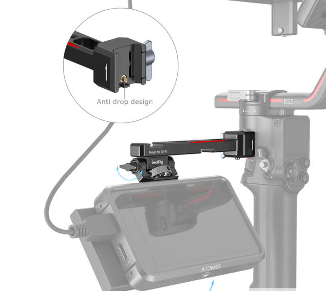 Die SmallRig Monitorhalterung für DJI RS 2 / RSC 2 / RS 3 / RS 3 Pro / RS 3 Mini 3026B wurde für DJI RS 2 / RSC 2 / RS 3 / RS 3 Pro / RS 3 Mini Gimbals entwickelt, um zusätzliches Zubehör zu montieren, wie z.B. Monitor, LED-Videoleuchte, Tonempfänger, Bildsender, Action-Kamera, etc. Mit der NATO-Klemme lässt sich der Gimbal schnell an beiden Seiten befestigen, wobei der Daumenknopf den Monitor um bis zu 170° neigen kann und die Klemme mit einem Fallschutz ausgestattet ist. Es gibt mehrere Befestigungspunkte für Zubehör, darunter zwei 1/4''-20-Bohrungen an der Oberseite für den Magic Arm 3238 für Action-Kameras oder Bildsender, sowie eine Kaltschuhhalterung an der Ober- und Unterseite für Tonempfänger, Mikrofon, LED-Videoleuchte usw. Ein weiteres Highlight ist der Anti-Twist-Stift, der zur weiteren Stabilisierung des Monitors beiträgt. Insgesamt ist der 3026B, der 5"- und 7"-Monitore unterstützt, kompakt und passt in Bezug auf Design und Zubehörbefestigung perfekt zu den DJI Gimbals der RS-Serie.
