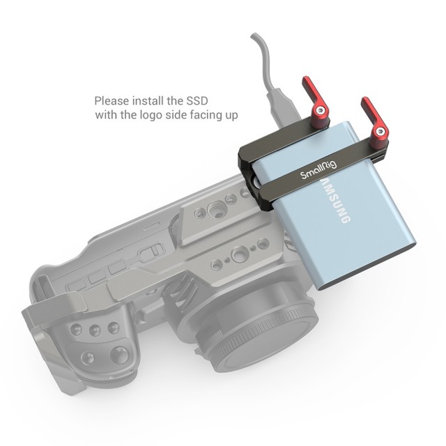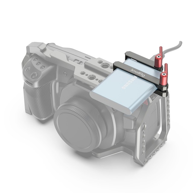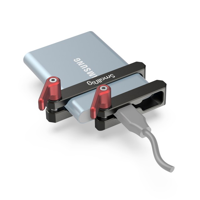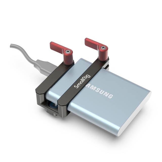 Mit der SmallRig Halterung für Samsung T5 SSD (Dark Olive) 2767 können Sie Ihre Samsung T5 SSD an ausgewählten SmallRig Käfigen, wie der BMPCC 4K/6K 2766, befestigen. Es wird mit zwei mitgelieferten 1/4"-20-Schrauben am Käfig befestigt und sichert die SSD und das angeschlossene USB-Typ-C-Kabel mit einer Rändelschraube. Durch die versetzte Anbringung der Halterung in der oberen linken Ecke des Käfigs werden Störungen durch den angebrachten oberen Griff, den seitlichen Griff oder anderes Zubehör vermieden.