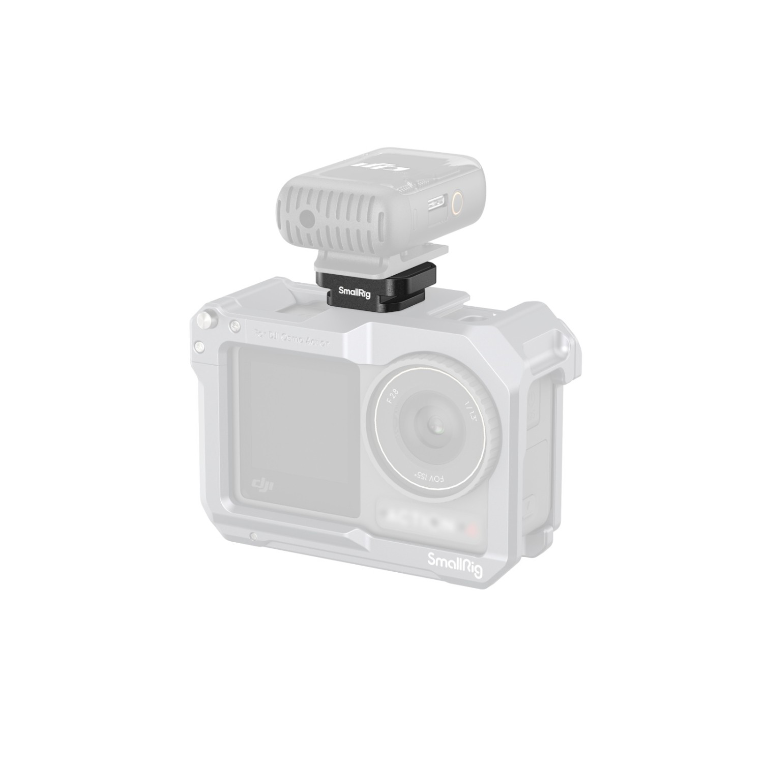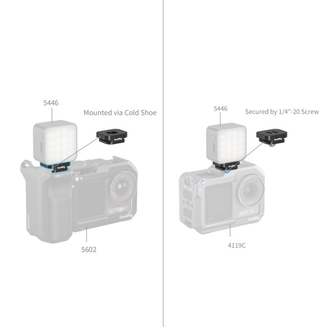 Die Halterungen unterstützen zwei Befestigungsmethoden: Kaltschuhbefestigung und Gewindebefestigung. Diese Flexibilität gewährleistet die Kompatibilität mit dem SmallRig-Käfig (ID 4119C) und den magnetischen Videoleuchten (ID 5446) sowie die nahtlose Integration mit dem DJI Mic 2.