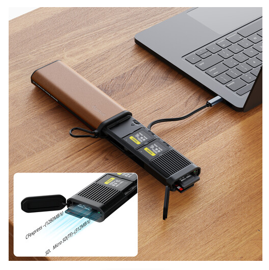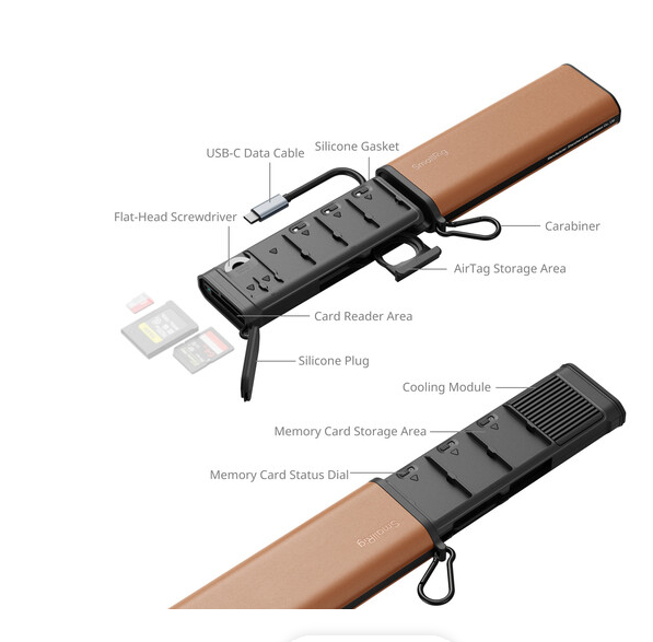 Übertragen Sie Daten mit rasanten Geschwindigkeiten von bis zu 1250 MB/s und speichern Sie bis zu neun Speicherkarten sicher mit dem multifunktionalen Kartenlesegerät und Aufbewahrungskoffer PGYTECH CFexpress Typ B. Er verfügt über simultane UHS-II SD/microSD- und CFexpress Typ B-Steckplätze, ein integriertes USB-C 3.2 Gen 2-Kabel mit Pass-Through-Ladefunktion, einen Aluminium-Kühlkörper für thermische Stabilität, IP54-Staub-/Spritzwasserschutz, einen AirTag-Steckplatz zur Ortung und eine robuste ABS/Aluminium-Konstruktion – alles in einem kompakten 235-g-Paket.