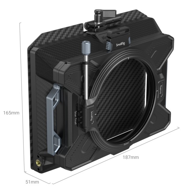 Das Kit enthält auch einen Filterrahmen (4x5,65") mit einem Rahmen aus einer Aluminiumlegierung und einem Anti-Aus-Design, das schnell und ohne Fingerabdrücke zu hinterlassen installiert werden kann. Für die Befestigung eines 4x4"-Filters kaufen Sie bitte den Filterrahmen 3648; für die gleichzeitige Aufnahme mehrerer Einschubfilter in einer komplexen Umgebung kaufen Sie bitte das Filter Frame Kit (4x5,65") 3649 oder das VND Filter Kit 3651. Dank des formschlüssigen Filtersystems werden Ultraweitwinkelaufnahmen mit ≥14mm Brennweite möglich. Die Gegenlichtblende lässt sich magnetisch befestigen und schnell abnehmen, und die Fahne aus Kohlefaser lässt sich um 180° öffnen. Um Blendeffekte zu vermeiden, kaufen Sie bitte das Side Flag Kit (95mm) 3647; um das Objektiv zu stützen und zu schützen, kaufen Sie bitte die Rod Support 3652. Unsere Star-Trail-Serie Matte Boxen verwenden viel leichtere Magnesiumlegierung und Kohlefaser, um leichte Aufnahmelösungen zu bieten.