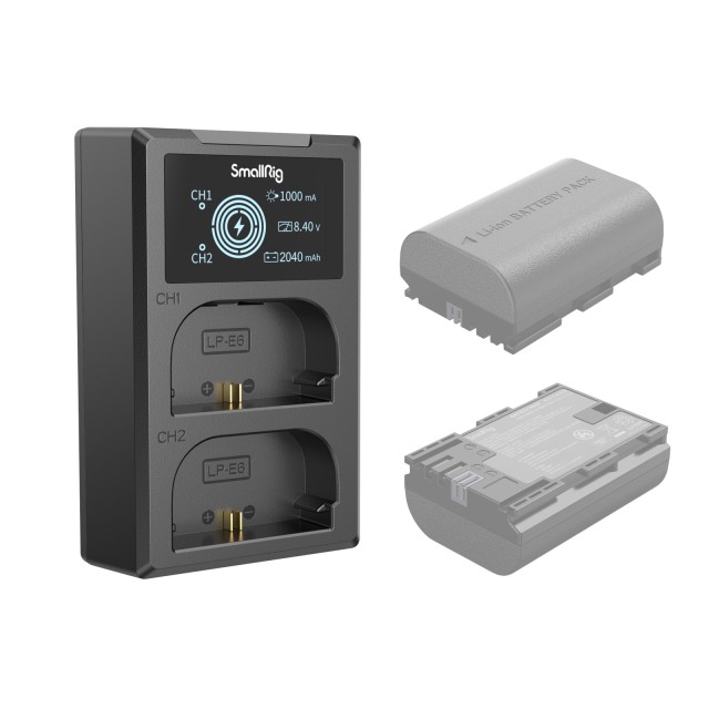 Das SmallRig LP-E6NH Kamera-Ladegerät 4084 ist aus hochwertigem ABS+PC feuerfestem Material gefertigt. Die Oberfläche ist mattiert, hochtemperaturbeständig, griffig und langlebig. Das eingebaute Batteriefach hat die gleiche Größe wie die Original-Kamera-Batterie, passt genau in das Batteriefach der Kamera und lässt sich ohne Verklemmung einsetzen. Das Ladegerät verfügt über einen Doppelschacht, mit dem zwei Akkus gleichzeitig geladen werden können. Der LCD-Bildschirm zeigt die Ladespannung, den Ladestrom und die Lademenge in Echtzeit an, so dass der Benutzer die Ladespannung, den Ladestrom und die Lademenge intuitiv erkennen kann. Das Ladegerät verfügt über eine integrierte USB-A-Ladeleitung und einen USB-C-Eingang, der über das Ladegerät, das Autoladegerät und die mobile Stromversorgung aufgeladen werden kann.