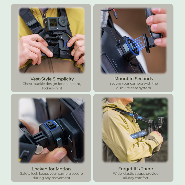 Die SmallRig Schnellverschluss-Brustgurtbefestigung für Actionkameras 5720 wurde für stabile, freihändige Aufnahmen in dynamischen Outdoor-Umgebungen entwickelt. Dank ihres vestenartigen Designs lässt sie sich in nur einer Sekunde anlegen oder abnehmen und bietet einen bequemen und festen Sitz für stabile Aufnahmen. Sie eignet sich ideal für Outdoor-Aktivitäten mit heftigen Bewegungen oder starken Vibrationen, wie Angeln, Bootfahren und Skifahren.