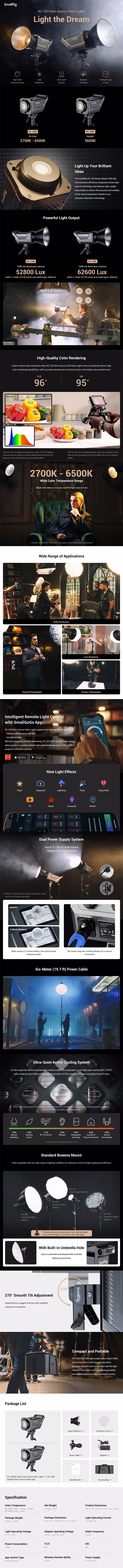 Die SmallRig RC120B (3615) repräsentiert die erste Generation der professionellen SmallRig Studio-LED-Leuchten. Sie nutzt die fortschrittliche COB (Chip-On-Board)-LED-Technologie für eine hohe Intensität (4.450 Lux) sowie einen hocheffizienten Reflektor, um bis zu 52.800 Lux in der Mitte des Lumen bei einer Entfernung von 1 m zu erreichen. Darüber hinaus bietet sie eine hohe Farbgenauigkeit (CRI 95+, TLCI 96+), ein Bowens-Bajonett für die einfache Montage von Standardzubehör (Softboxen usw.) und neun integrierte Effekte (Paparazzi, Feuerwerk, Blitz, Fault Bulb, TV, Atem, Blitz, Party, Flamme), die sowohl manuell als auch drahtlos über die SmallGoGo-App gesteuert werden können, sowie eine stufenlose Intensitätseinstellung. Die Variante RC120B hat eine einstellbare Farbtemperatur von 2700-5600K (+/- 200K) und eine maximale Lichtstärke von 4.450 lx bzw. 52.800 lx mit montiertem Reflektor.