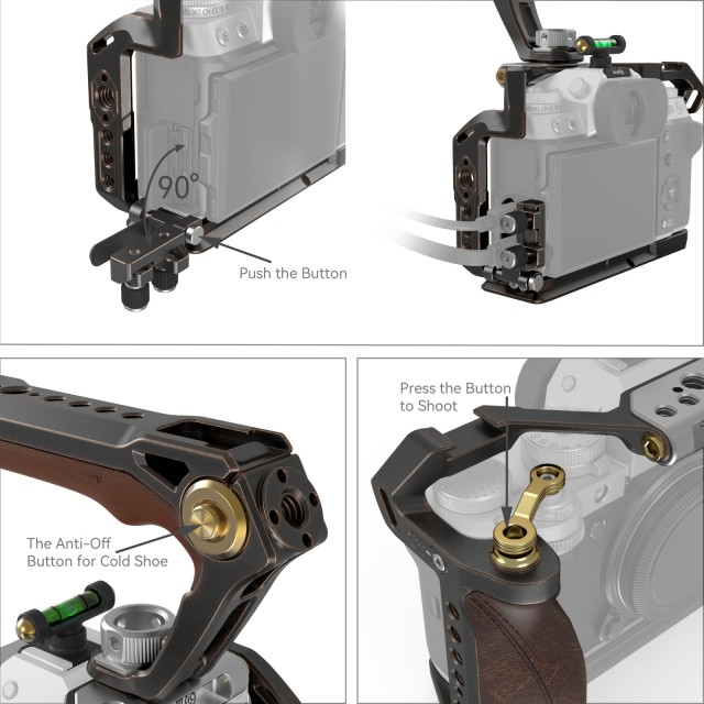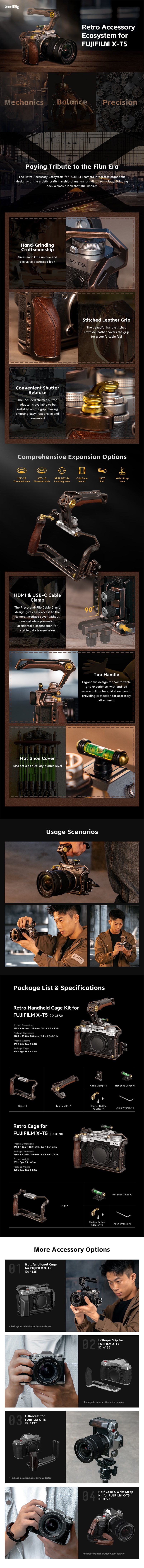 Das SmallRig Retro Handheld Cage Kit für FUJIFILM X-T5 3872 wurde entwickelt, um Aufnahmen aus niedrigen Winkeln zu erleichtern, die Kamera zu schützen und Befestigungspunkte für Zubehör bereitzustellen. Das Kit umfasst einen Käfig, einen oberen Griff, eine HDMI- und USB-C-Kabelklemme sowie eine Blitzschuhabdeckung. Der Käfig ist mit einem neuen Punk-Stil ausgestattet, der einen Auslöser-Adapterrahmen und einen ergonomischen Ledergriff für eine verbesserte Auslöserkontrolle und ein besseres Grifferlebnis bietet.