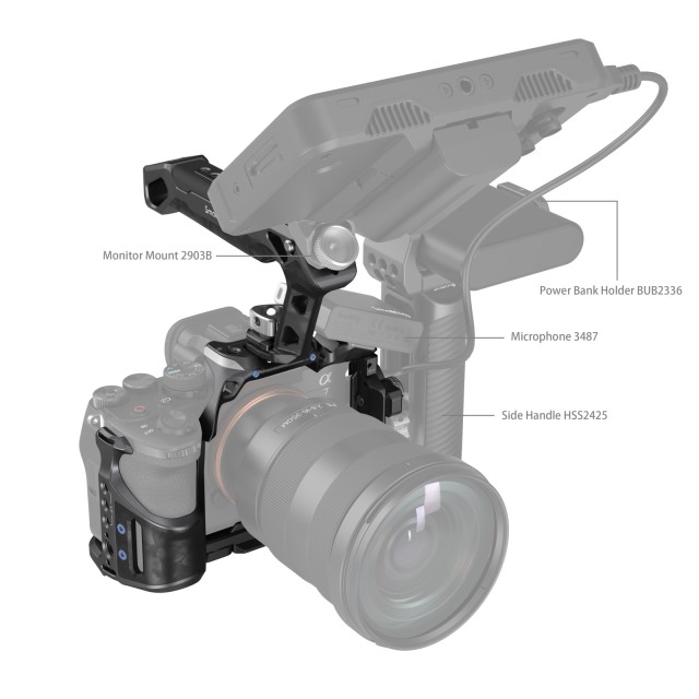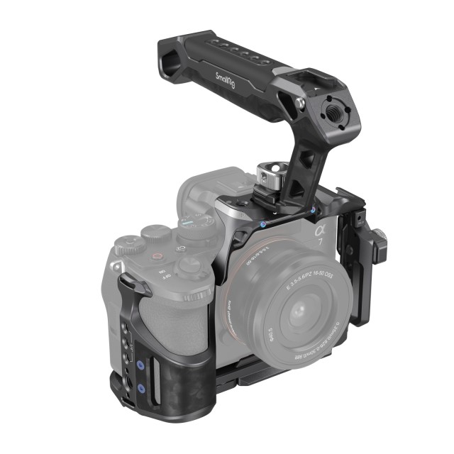 Das SmallRig "Rhinoceros" Basic Cage Kit für Sony Alpha 7R V / Alpha 7 IV / Alpha 7S III 3708 wurde entwickelt, um Aufnahmen aus niedrigen Winkeln zu erleichtern, die Kamera zu schützen und Befestigungspunkte für Zubehör bereitzustellen. Das Kit umfasst einen Käfig, einen oberen Griff und eine HDMI-Kabelklemme. Sowohl der Käfig als auch der obere Handgriff sind tragbar, da sie aus leichterer Kohlefaser gefertigt sind, was längere Aufnahmen aus der Hand ermöglicht. Beim Käfig sorgen ein Fixierstift, eine 1/4"-20-Schraube und eine M2,5-Schraube zusammen für eine sichere Befestigung der Kamera. Die Kamera verfügt über ein klares, stromlinienförmiges Design, das den vollen Zugriff auf die oberen Tasten ermöglicht.