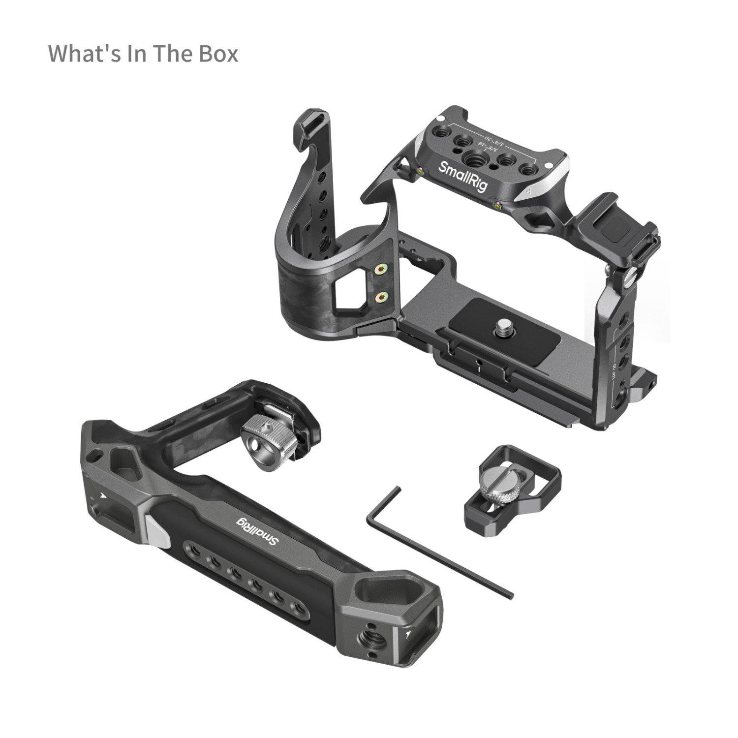 Das Set enthält einen „Rhinoceros“-Käfig, einen „Rhinoceros“-Obergriff und eine Klemme für HDMI-Kabel. Der Käfig und der Obergriff sind aus Kohlefaser gefertigt, extrem leicht und tragbar – ideal für den langfristigen Handgebrauch.