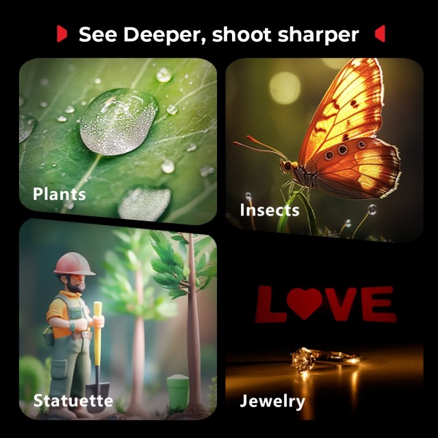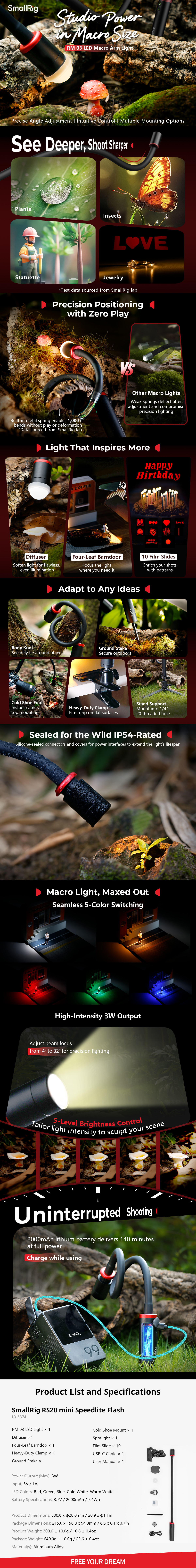 Die RM 03 ist eine spezielle LED-Leuchte für die Makrofotografie. Dank ihrer robusten integrierten Metallfeder lässt sich der Beleuchtungswinkel mühelos einstellen. Im Lieferumfang sind Zubehörteile zur Lichtsteuerung enthalten, darunter ein Diffusor und eine vierflügelige Blende, sowie vielseitige Befestigungsoptionen wie eine robuste Klemme und ein Erdspieß, die für unübertroffene Flexibilität sorgen. Mit der Schutzart IP54 für Wetterbeständigkeit und fünf leistungsstarken 3-W-LED-Lampen, die eine mehrfarbige Lichtabgabe unterstützen, inspiriert die RM 03 zu grenzenloser, lang anhaltender (bis zu 140 Minuten Betriebszeit) Kreativität in der Makrofotografie.