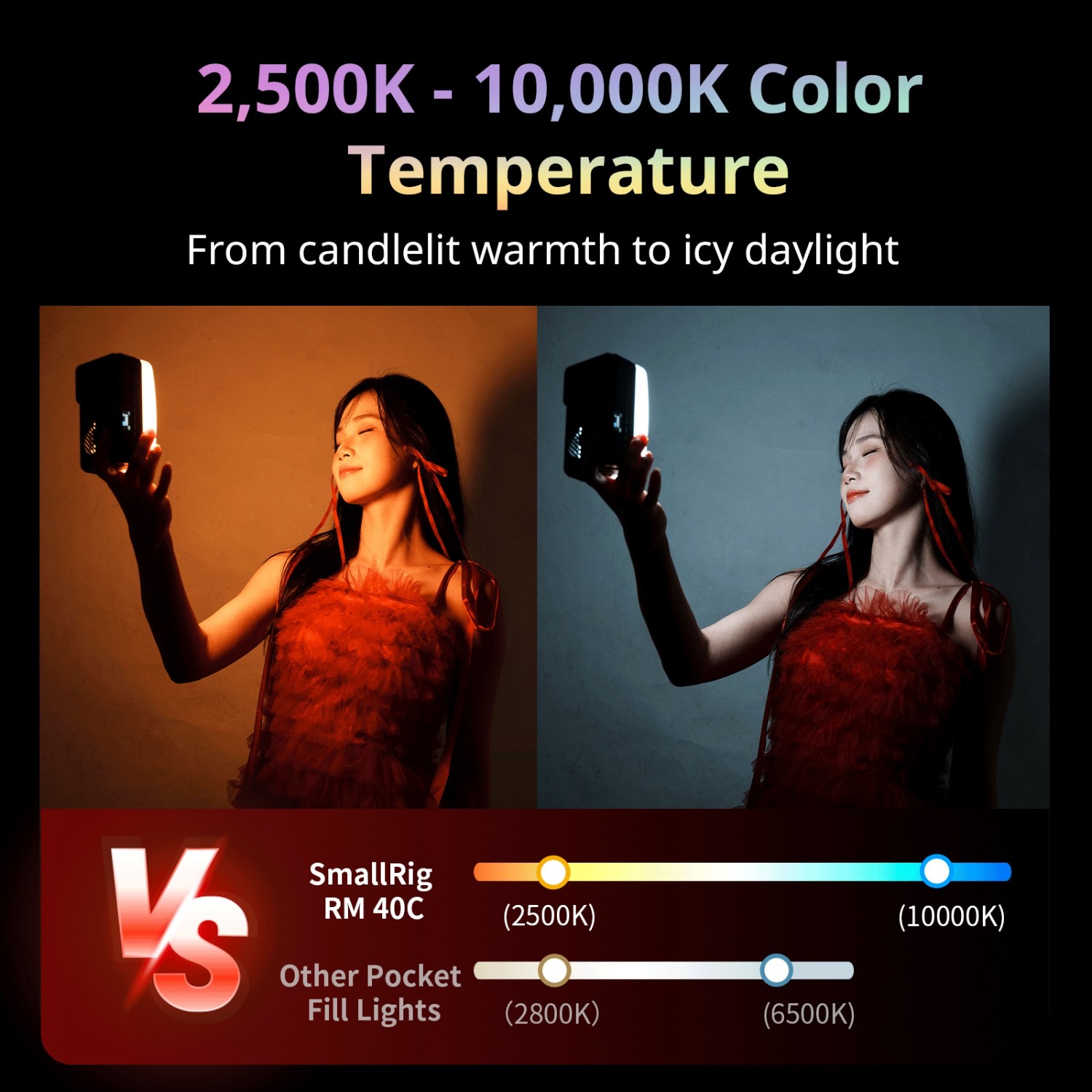 Die SmallRig RM 40C ist eine leistungsstarke 40-W-RGBWW-Mini-LED-Leuchte. Sie ist kompakt und dennoch leistungsstark und verfügt über eine verlängerte Betriebsdauer von 55 Minuten sowie eine Vollfarb-RGB-Beleuchtung für eine breitere Farbtemperatur- und Farbumfangsteuerung. Mit ihrer benutzerfreundlichen Bedienung, der magnetischen Befestigung und der PD-Schnellladefunktion ist sie perfekt für kreative Menschen, die viel unterwegs sind.