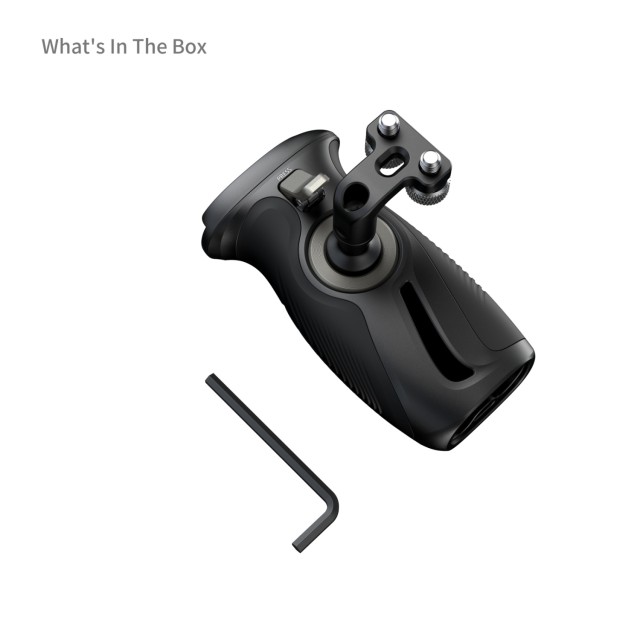 Der drehbare Seitengriff mit 1/4"-20 Schrauben 5194 lässt sich mit einem Tastendruck um 360° drehen und ermöglicht so eine reibungslose Winkelverstellung während der Aufnahme. Er bietet vielseitige Erweiterungsmöglichkeiten durch mehrere Montageschnittstellen, darunter 1/4"-20-Aufnahmebohrungen für Fernsteuerungen (ID 3902) und Magic Arms (ID 3873) sowie eine Kaltschuhhalterung für Zubehör wie Monitorhalterungen (ID 2905B), Mikrofone (ID 3487), Videoleuchten (ID 3286B) und das DJI Mic 2.