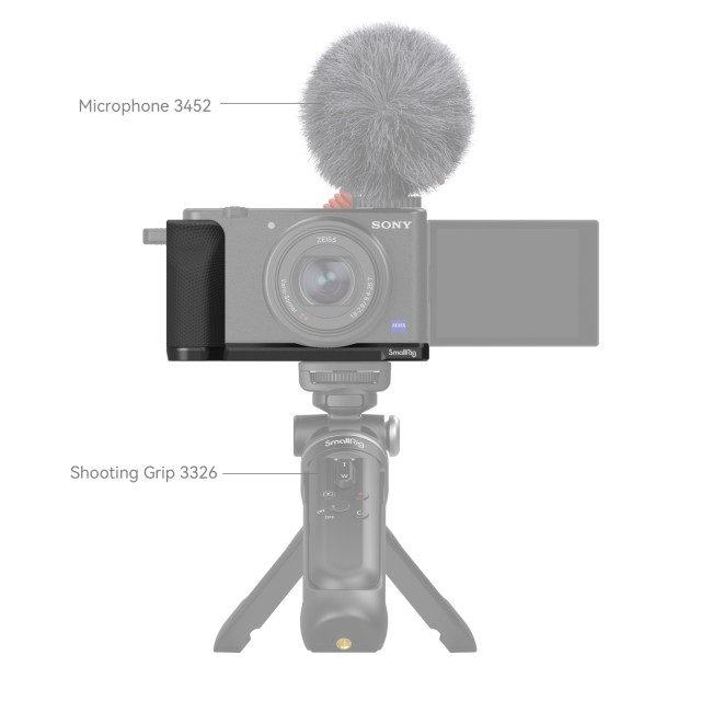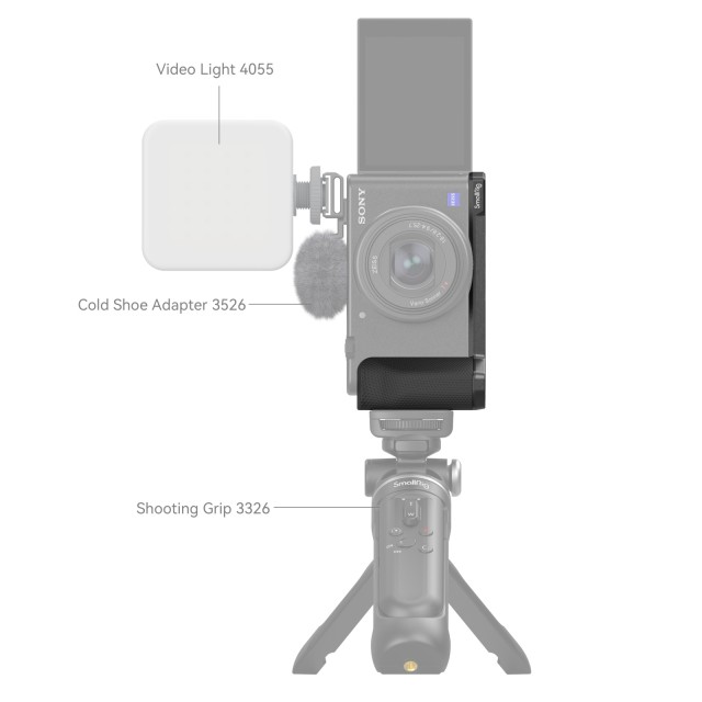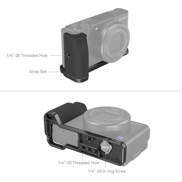 SmallRig Handle für Sony ZV-1F 4146 wurde entwickelt, um die Griffigkeit zu verbessern, den Boden des Käfigs zu schützen und vertikale Aufnahmen zu erleichtern. Der ergonomische Silikongriff, der die Kamera über eine 1/4"-20 D-Ring-Schraube fixiert, bietet einen festeren Griff, um ein versehentliches Herunterfallen zu verhindern, und verfügt über ein 1/4"-20-Gewindeloch in der rechten Objektivmitte für den Wireless Shooting Grip 3326 für vertikale Aufnahmen. Der Griff verfügt außerdem über 1/4"-20-Gewindebohrungen an der Unterseite zur Befestigung einer Schnellwechselplatte und über Löcher in der Bodenplatte für die Handschlaufe PSW2398.