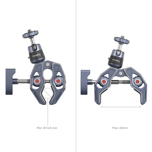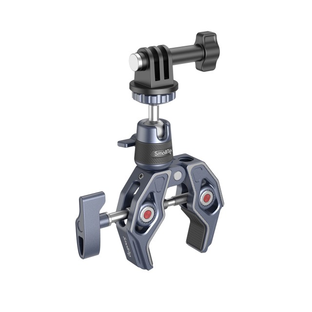 SmallRig Super Clamp mit 360°-Kugelkopfhalterung für Action-Kameras 4102 besteht aus einer Aluminiumlegierung in Flugzeugqualität und rostfreiem Stahl, der im CNC-Verfahren eloxiert und geschliffen wurde, um die Robustheit und Haltbarkeit zu erhöhen. Sie verfügt über ein Skelettdesign und eine Haifischklemme mit stärkerer Klemmkraft sowie weithin kompatible 1/4"-20-Gewindebohrungen, 3/8"-16-Gewindebohrungen und ARRI 3/8"-16-Aufnahmelöcher. Mit der Klemme, die eine Stange mit einem Mindestdurchmesser von 14 mm und eine Oberfläche mit einer maximalen Dicke von 65 mm unterstützt, lassen sich Kameras, Monitore, LED-Videoleuchten usw. schnell an Rundrohren, Tischen, Lenkern, Stativen und Stabilisatorhandringen befestigen.