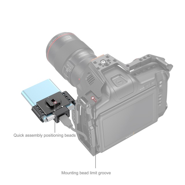 Montagerahmen für T5/T7 SSDs und SmallRig 3270 Kamerakäfig für BMPCC 6K Pro. Wird an der Blitzbuchse an der linken oberen Seite des Käfigs oder am 1/4"-20-Gewinde befestigt (Schraube im Lieferumfang enthalten). Die Gummipuffer verhindern ein Verkratzen der Disc, und es gibt auch eine Klemme für das USB-Kabel, die sich leicht von Hand festziehen/lösen lässt. Gewicht 41 g ±5 g.