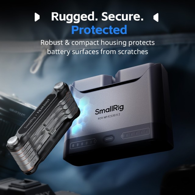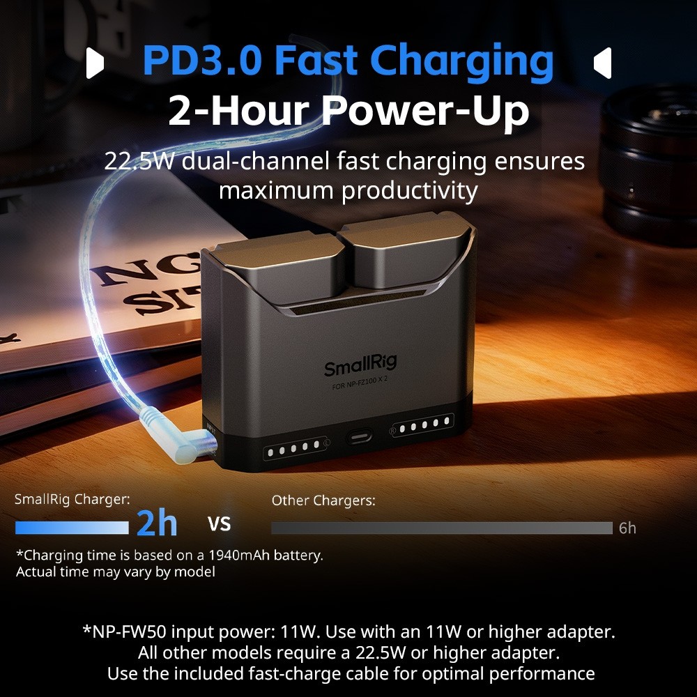 Das SmallRig Turbo-Ladegerät für NP-FW50-Kamerabatterien 5488 enthält zwei Batterien und ein zweikanaliges Schnellladegerät. Mit einem vollständigen Decodierungschip gewährleistet dieses Kit die vollständige Kompatibilität mit Sony NP-FW50-Batterien, wodurch Popup-Warnungen vermieden werden und gleichzeitig die Stromanzeige in der Kamera sowie die Verwendung des Original-Ladegeräts unterstützt werden.