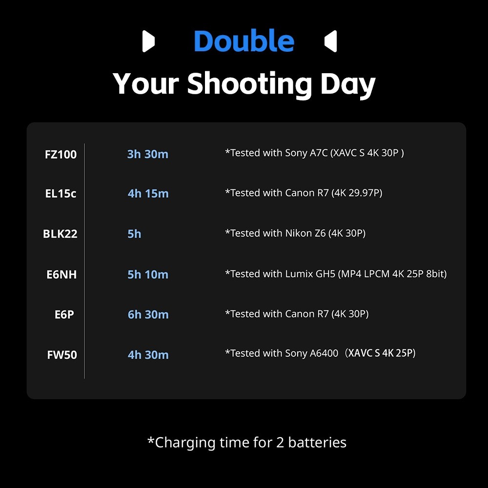 Jeder Akku liefert eine Nennleistung von 1030 mAh und ermöglicht so eine längere Aufnahmezeit für anspruchsvolle Arbeitsabläufe. Das Dual-Slot-Design des Ladegeräts ermöglicht das gleichzeitige Laden von zwei Akkus oder das Laden eines einzelnen Akkus und lädt zwei Akkus in etwa 1,5 Stunden vollständig auf, was eine optimale Effizienz gewährleistet.