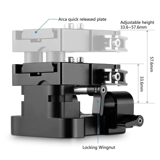 3. Die Stangenklemme kann mit einem Knopf schnell eingestellt werden, um eine 85 mm Standard-Stangenhöhe für die meisten DSLR-Kameras zu gewährleisten. (Der Abstand von der Mitte der Stange zur Oberfläche der QR-Platte reicht von 57 bis 81 mm)
