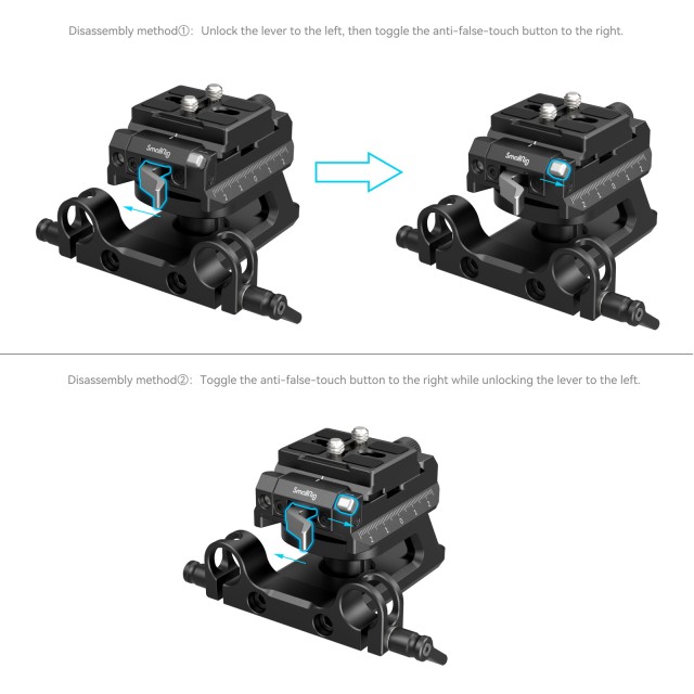 5. Die Arca-Basis ist sowohl horizontal als auch vertikal verstellbar. Die horizontale Verstellung erleichtert die Montage des Käfigs, während die vertikale Verstellung die Anpassung des Schwerpunkts des Teleobjektivs erleichtert.