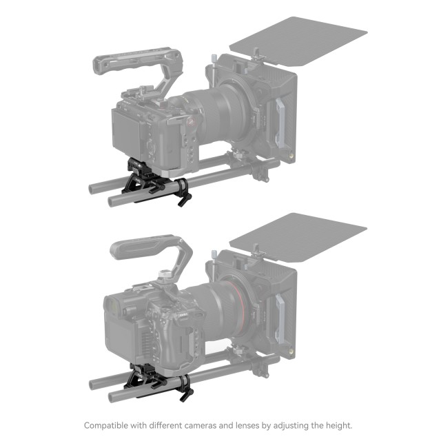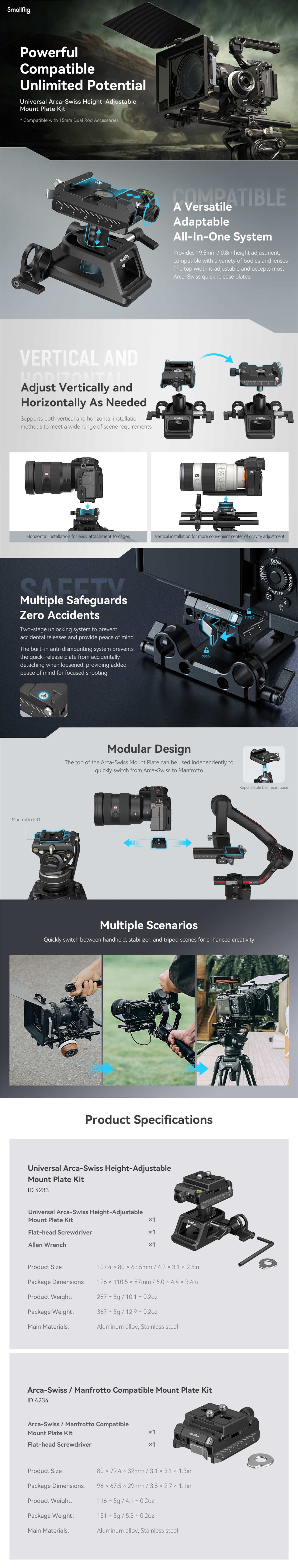 Das SmallRig Universal Arca-Swiss Height-Adjustable Mount Plate Kit 4233 wurde entwickelt, um dem Benutzer die Installation von Zubehör wie Follow Focus, Matte Box, Objektivhalterung usw. nach der Installation der 15-mm-Stangen zu erleichtern. Die Montageplatte ist höhenverstellbar und mit den meisten spiegellosen Kameras und Objektiven kompatibel. Die obere Breite kann über einen Knopf schnell eingestellt werden, so dass die Kompatibilität mit den meisten auf dem Markt erhältlichen Arca-Schnellwechselplatten gewährleistet ist und es keine Kompatibilitätsprobleme gibt. Die mitgelieferte Arca-Schnellwechselplatte ist mit den DJI-Stabilisatoren der RS-Serie kompatibel und ermöglicht einen schnellen Wechsel zwischen Handheld-, Stabilisator- und Stativ-Setups; Verriegelungshebel mit zweistufigem Entriegelungsdesign und eingebauter Anti-Dislodgement-Funktion, die einen versehentlichen Kontakt verhindert, um die Sicherheit der Ausrüstung zu gewährleisten. Die Oberseite der Montageplatte ist modular aufgebaut, so dass die Ausrichtung für die Kompatibilität mit Käfigen und Teleobjektiven leicht geändert werden kann, um den Schwerpunkt anzupassen. In zerlegtem Zustand kann sie unabhängig als Arca-Swiss/Manfrotto-Montageplatte verwendet werden. Eingebaute 1/4"-20-Gewindebohrungen und 3/8"-16-Gewindebohrungen an der Unterseite, erweiterbare Schnellwechselplatte zur einfachen Befestigung an einem Stativ.