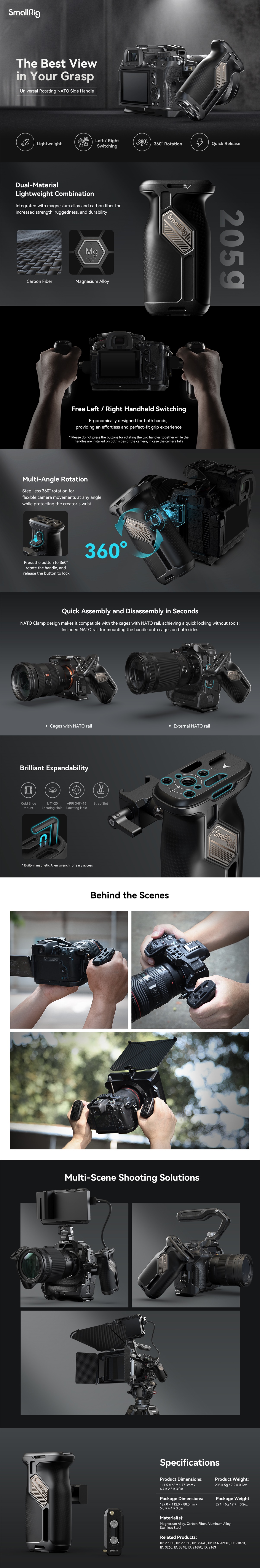 Der SmallRig Universal Rotating NATO Side Handle 3847 wurde entwickelt, um die Kamerabewegung zu unterstützen und die Aufnahmestabilität zu verbessern. Der aus einer stabilen, leichten Magnesiumlegierung und Karbonfaser gefertigte Griff lässt sich während des Filmens über den Entriegelungsknopf um 360 Grad drehen und passt mit seinem ergonomischen Design sowohl in die linke als auch in die rechte Hand. Er verfügt über Befestigungspunkte für Zubehör wie eine kalte Schuhhalterung an der Oberseite für die Monitorhalterung 2905B, ein Mikrofon, eine LED-Leuchte usw., eine ARRI 3/8"-16-Aufnahmebohrung für die Monitorhalterung 2903B, drei 1/4"-20-Gewindebohrungen für den Magic Arm 2070B, den Magic Arm mit kleinem Kugelkopf 2157 usw. und eine Riemenbohrung für den Handriemen 3848 für mehr Stabilität. An der Unterseite befindet sich ein magnetischer Schraubenschlüssel für einen einfachen Zugang. Außerdem befindet sich in der Verpackung eine NATO-Schiene, mit der Sie den Griff an Käfigen ohne NATO-Schiene auf beiden Seiten befestigen können.