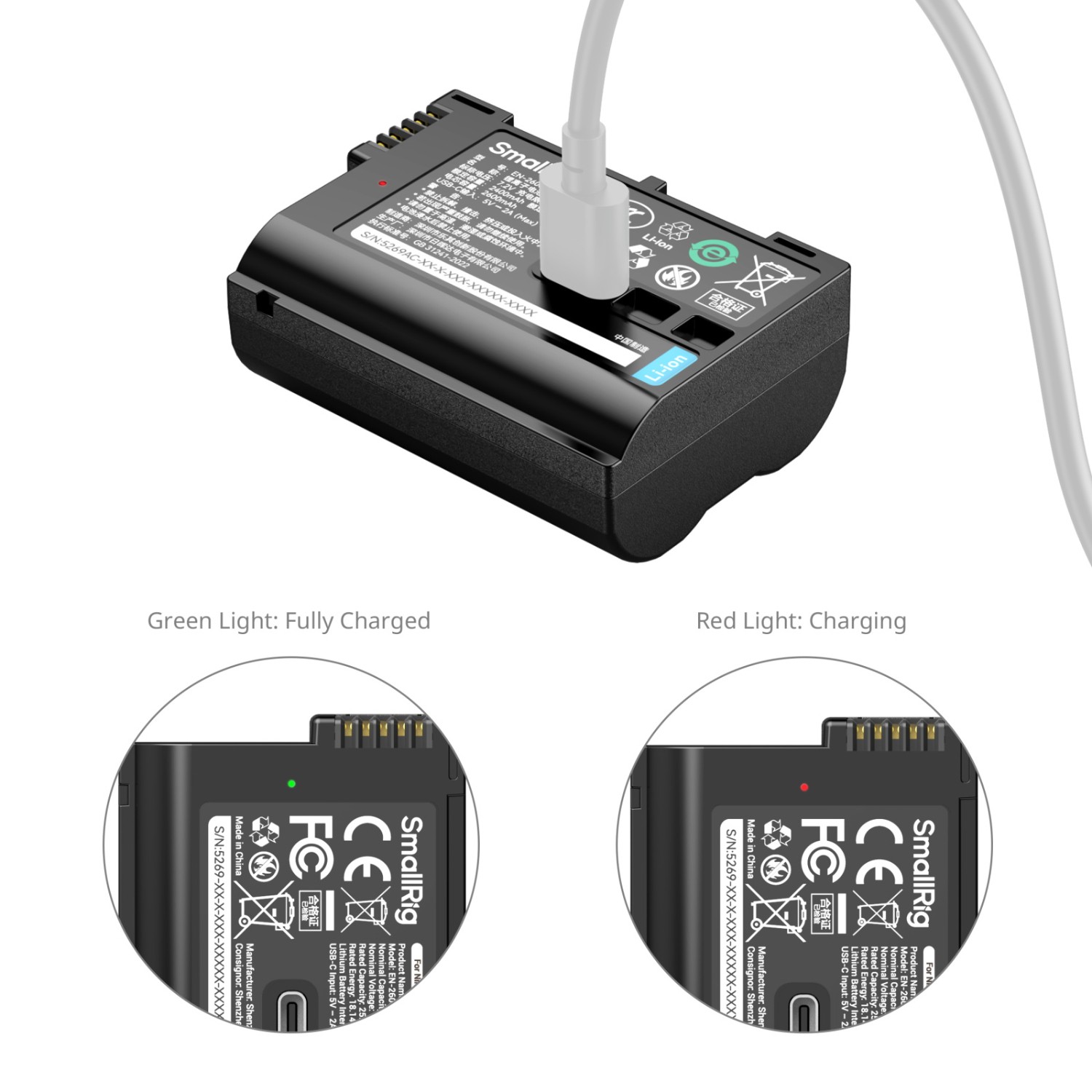 Der integrierte USB-C-Ladeanschluss ermöglicht das direkte Laden über Powerbanks, Wandadapter, Autoladegeräte oder Steckdosenleisten, sodass kein spezielles Ladegerät erforderlich ist. Der Akku unterstützt eine Eingangsleistung von 5 V/2 A und ist in etwa 2,5 Stunden vollständig aufgeladen. Der SmallRig EN-EL15c-Akku ist in einem leichten, feuerfesten Kunststoffgehäuse mit strapazierfähigem Design untergebracht und wird mit einem USB-A-zu-USB-C-Ladekabel und einer Schutzabdeckung für die Kontakte geliefert, wodurch er sich ideal für Reisen, Studio- und Außeneinsätze eignet.