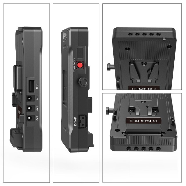 Die SmallRig V-Mount-Akkuplatte mit doppelter 15-mm-Stabklemme 3203 wurde entwickelt, um die Akkulaufzeit für Ihr Kamera-Rig über einen V-Mount-Akku zu verlängern. Die Platte mit einem Standard-V-Mount ist für die meisten Vmount-Batterien geeignet. Es verfügt über einen 8-V-Gleichstromausgang, zwei 12-V-Gleichstromausgänge, einen 14,8-V-D-Tap-Ausgang und einen 5-V/2-A-USB-Ausgang, über den Sie Ihre Kamera oder Ihren Camcorder und anderes externes Zubehör wie Monitor, Telefon usw. mit Strom versorgen können. Er verfügt über einen Schalter, der alle Ausgangsanschlüsse steuert, damit Sie Ihre Anlage schneller und bequemer ein- und ausschalten können. Es wird mit einer doppelten 15-mm-Rutenklemme geliefert, um das Brett an Ihrem 15-mm-LWS-Rutensystem zu befestigen, und mit mehreren 1/4"-20-Gewindebohrungen auf der Rückseite, oben und unten, um eine doppelte Rutenklemme, einen magischen Arm oder anderes Zubehör anzubringen.