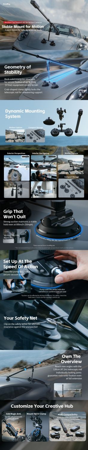 Dieses Befestigungskit besteht hauptsächlich aus einer Aluminiumlegierung und gewährleistet Langlebigkeit und Stabilität mit einer dynamischen Tragfähigkeit von 0,5 kg / 1,1 lb, sodass es für die meisten Actionkameras auf dem Markt geeignet ist. Die Saugnäpfe verfügen über einen Push-Pump-Mechanismus und eine weiße Sicherheitsanzeigelinie zur übersichtlichen Überwachung des Saugstatus, wodurch eine sichere und stabile Halterung gewährleistet ist. Die Teleskopstange ist von 45 bis 120 cm (17,7 bis 47,2 Zoll) verstellbar und verfügt über Drehverschlüsse an jedem Abschnitt, um ein Verrutschen während dynamischer Aufnahmen zu verhindern.