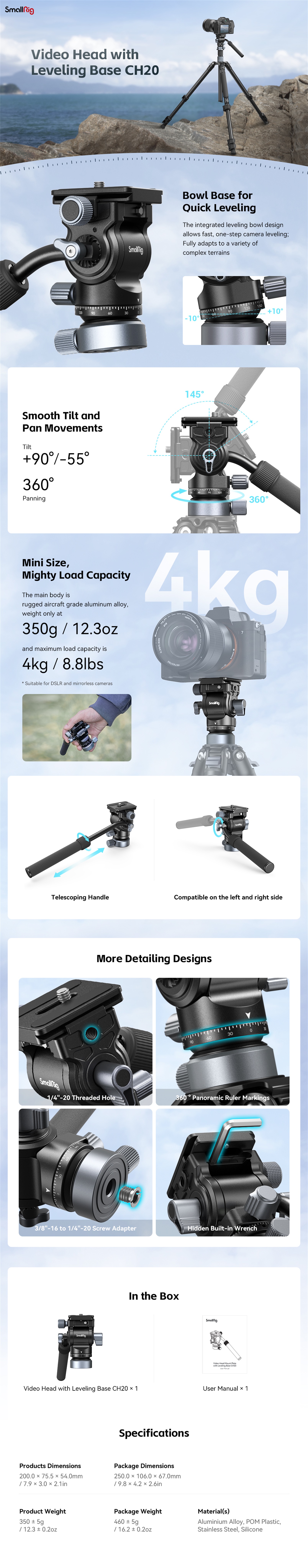 SmallRig Video Head Mount Plate with Leveling Base CH20 4170B ist ein kompakter und tragbarer Fluidkopf für Videoaufnahmen. Er verfügt über eine integrierte Schalenbasis, die eine 10/10°-Einstellung zur schnellen Nivellierung ermöglicht, und wiegt nur 350 g, um bis zu 4 kg zu tragen. Dank des abnehmbaren Teleskopgriffs lässt er sich leicht verstauen und transportieren; die 1/4"-20-Gewindebohrung ermöglicht den Anschluss von Zubehör wie z. B. einem Zauberarm. Der Kopf ist um 360° schwenkbar und um 90°/55° neigbar, um Aufnahmen aus verschiedenen Winkeln zu ermöglichen. Außerdem hilft ein eingebauter Inbusschlüssel bei der Montage oder Demontage Ihrer Kamera.