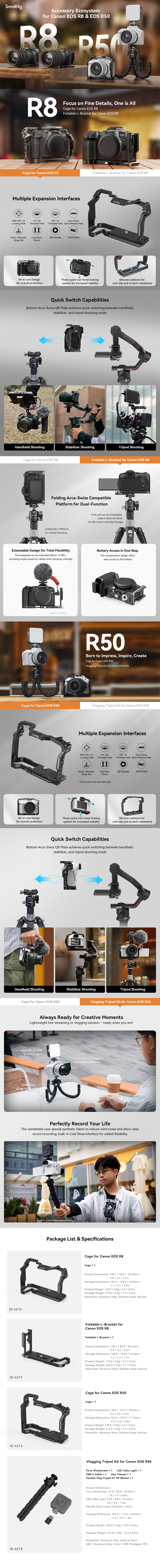 Das SmallRig Vlogging Stativ-Kit für Canon EOS R50 4213 wurde entwickelt, um eine leichte und dennoch tragbare Vlog-Aufnahmelösung für Content Creators zu bieten. Es ist perfekt, um qualitativ hochwertige Aufnahmen, super stabile Handheld-Aufnahmen und einfache Farbanpassung für die Postproduktion zu erreichen, enthält einen pelzigen Windschutz, ein flexibles Stativ und eine LED-Videoleuchte. Der pelzige Windschutz besteht aus spezieller Polyesterwolle und einem verdickten Futter, um Windgeräusche bei Außenaufnahmen zu reduzieren. Die Kamera wird über einen Kaltschuhadapter mit schützenden Silikonpolstern an der Unterseite und einer Kaltschuhhalterung für LED-Videolicht, Mikrofon usw. sicher an einem Blitzschuh befestigt.