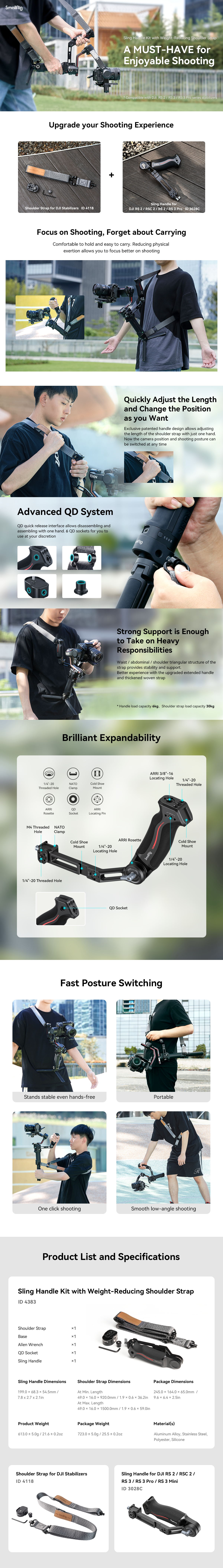SmallRig Sling Handle mit gewichtsreduzierendem Schultergurt Kit für DJI RS 2 / RS 3 / RS 3 Pro / RS 4 / RS 4 Pro 4383B wurde speziell für DJI RS 2 / RS 3 / RS 3 Pro / RS 4 / RS 4 Pro entwickelt. Sie müssen nur die Grundplatte mit der 1/4-20"-Schraube an der Unterseite eines DJI-Gimbals befestigen, den Schultergurt über Ihre rechte Schulter legen und dann das Gimbal-Stativ ausfahren. Wenn Sie drehen, nehmen Sie den Gimbal einfach in die Hand; bei statischen Aufnahmen entlastet er Ihre Arme fast vollständig. Wenn Sie nicht fotografieren, lassen Sie den Gimbal einfach los und tragen ihn wie eine Umhängetasche vor sich her oder an der Seite, was die Belastung der Arme weitgehend reduziert. Der Schultergurt ist mit QD-Halterungen und Riemenbügeln ausgestattet, die eine einfache Befestigung von Zubehör und Längenanpassung ermöglichen. 1/4-20"- und 3/8-16"-Gewindebohrungen in der Grundplatte ermöglichen die Befestigung von Stativen oder anderen Geräten.