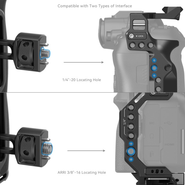 Kompatibilität: Käfige oder Montageplatten mit seitlichen 1/4"-20-Aufnahmebohrungen oder 3/8''-16 ARRI-Aufnahmebohrungen