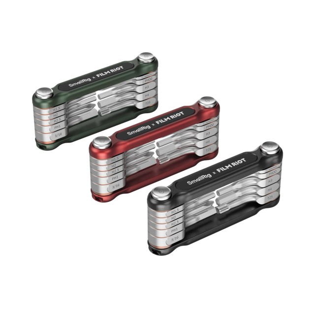 Der SmallRig x FILM RIOT 10-in-1-Klappschlüssel-Satz mit mehreren Winkelpositionen (grün) 4814 wurde speziell für Foto- und Videofilmer entwickelt. Das 10-in-1-Set verfügt über ein faltbares Design, das Tragbarkeit und Bequemlichkeit gewährleistet und die in der Foto- und Videobranche üblichen Schraubenschlüsselgrößen abdeckt. Dank einer exklusiven, patentierten Konstruktion kann jeder Schlüssel sicher in einem Winkel von 90° oder 180° positioniert werden, was eine effiziente Montage und Demontage von Zubehör vor und nach dem Dreh erleichtert. Das Set ist mit einer rutschfesten Silikonbeschichtung versehen, die einen angenehmen Griff ermöglicht. Gefertigt aus einer Aluminiumlegierung und rostfreiem Stahl, garantiert dieses Schlüsselset Langlebigkeit und Zuverlässigkeit.