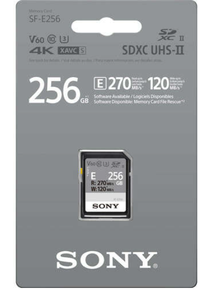 Die Sony SDXC SF-E 256 GB UHS-II V60 Speicherkarte bietet eine hohe Leistung mit Lesegeschwindigkeiten von bis zu 270 MB/s und Schreibgeschwindigkeiten von bis zu 120 MB/s und eignet sich ideal für 4K-Videos und Hochgeschwindigkeitsfotografie.