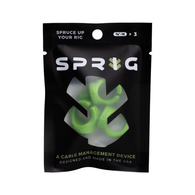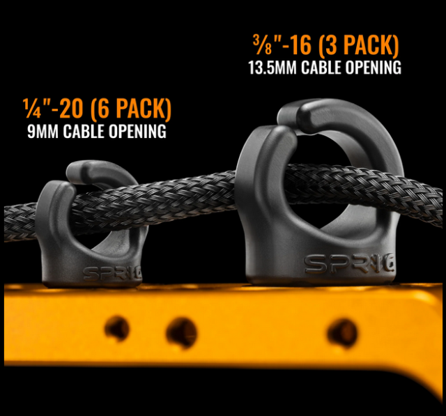Sprig ist aus einem starken und flexiblen Material spritzgegossen, um einen Kabelhaken zu schaffen, der am Set überlebt und unter Druck nicht bricht. Die Kabelöffnung hat einen Durchmesser von 0,53".