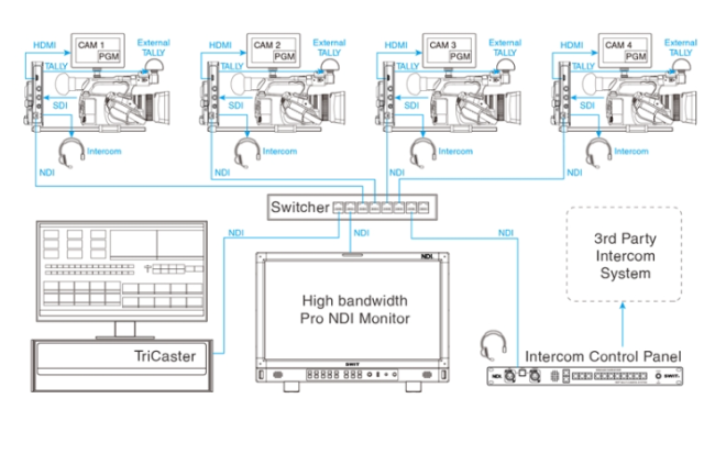 Das ET-N80 kann mit bis zu 8 Kameraadaptern verbunden werden, unterstützt sowohl die Modelle EC-N200 (HD) als auch EC-N200-4K und ermöglicht Link-Verbindungen zur Erweiterung der Intercom-Kanäle für größere Multi-Kamera-Setups. Es bietet Vollduplex-Intercom-Kommunikation, sodass Regisseur und Kameraleute gleichzeitig sprechen und zuhören können.